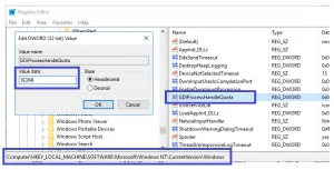 Locate to the key: HKEY_LOCAL_MACHINE> SOFTWARE> Microsoft> Windows NT> CurrentVersion> Windows> GDIProcessHandleQuota