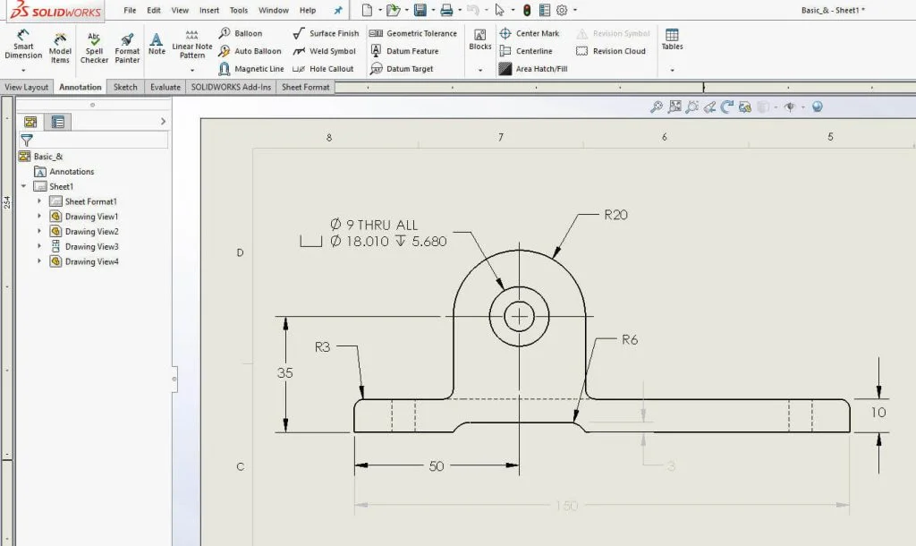 Step 4: Deactivate the Hide/Show Annotations – If only dimension “3” is selected, it will show up after deactivating the Hide/Show Annotations and others would still be hidden. In the following image, dimension “3” is selected to show up, while dimension “150” is still hidden.