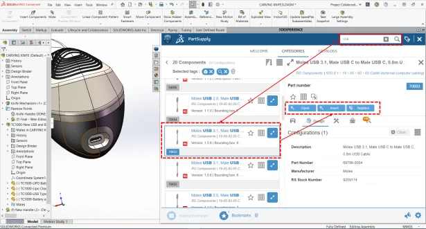 Let’s search for USB Type C Connector and insert it into the assembly to check the interface with the product body. when searching for “USB”. based on metadata I got 20 Components list, now based on my requirement I will select the component & simply perform the operation like Open, Insert or Replace. So, here I will use “Insert” command to insert the component in assemble. I will perform Open command to open file separately or Replace command to replace the existing file from the assembly.