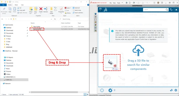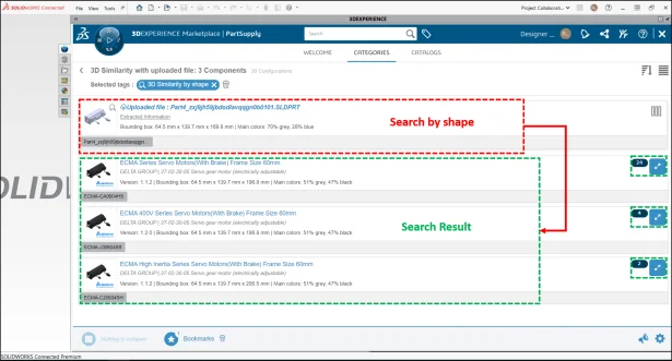 To search file based on 3D shape of the component, just drag and drop the file from your windows explore to Part supply window. Based on the shape, the search will suggest similar products. As shown in below image.