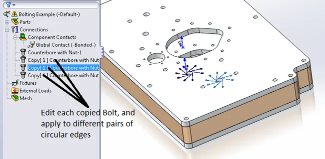 So, start by filling out the complete dialog for only one Bolt Connector. Hit GO, so that you are returned to the Simulation feature manager. Then right-mouse-click over your first Bolt Connector feature, and choose COPY. Right-mouse-click again, over the folder for all of the CONNECTORS, and hit PASTE.