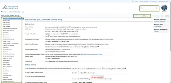 The SOLIDWORKS Help menu is a great resource for discovering how to use different pieces of SOLIDWORKS. The Help menu can be found inside of SOLIDWORKS by going to Help > SOLIDWORKS Help. This will bring up the online help menu where you can browse topics on the left side pane. Or, the search functionality near the top will help find what you are looking for very quickly. You can also access different versions of the help menu if required.