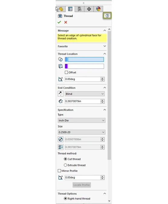 If these methods aren’t enough, SOLIDWORKS also provides access to the Help menu in context of the feature you are trying to use. For example, if you are using the Thread feature for the first time you can simply click the (?) at the top right of the PropertyManager to browse directly to the page for the Thread feature.