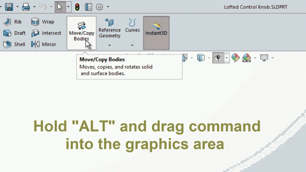 Introducing the SOLIDWORKS search commands. This function allows you to activate and locate commands from a single window without relying on frequent mouse movements. Found in the upper right corner, using this more often will lead to saving those precious seconds and likewise, it also offers easy customization options to making those commands more accessible.