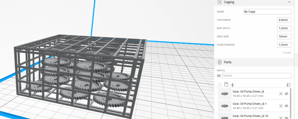 A special feature of Smartstream is the Caging option. This allows me to create a cage around my small parts so they do not get lost during the cleaning process. Below, you see 32 gears and the caging parameters I used on the right side.