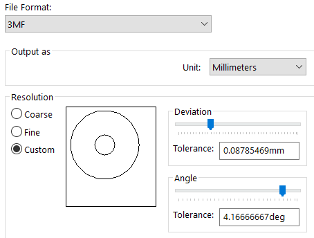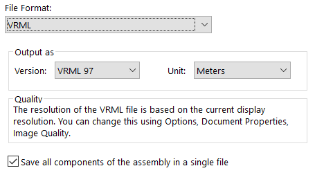Once I answer these questions and create my model, I export it in one of three file formats: STL, 3MF or VRML. Today, I am using STL, for simplicity and ease of use. If the model sent from another user is in one of these formats, I can use it directly. If not, I can open it in SOLIDWORKS and save it as needed.