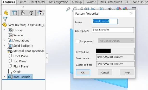 Educators have challenges. We ask you provide our SOLIDWORKS certification exams to your students in a proctored setting. We also provide a tool inside of SOLIDWORKS to determine the user name, creation date and modified date of a particular feature.