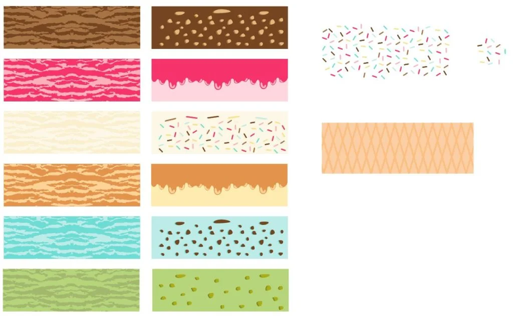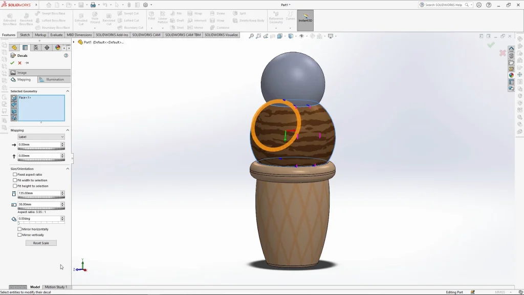 Below is a visual of all the decals used, as you can see, the top ice cream scoop decals that are spherical at the top needed to be edited for the top of the curve, as the artwork is stretched towards the top. The useful thing with SOLIDWORKS is that I can edit and export the decals, and they change in SOLIDWORKS in real time as I do it so, this allows me to how to fix the decals. When designing the decals below, some seen on the left side where mirrored from the middle, so they could overlap as they were applied as a label. Others in the centre the details or patterns didn’t run to the sides so that the color could overlap, and the shapes around the top of the decal that would sit at the top of the sphere were stretched because they become squished around the top of the sphere.