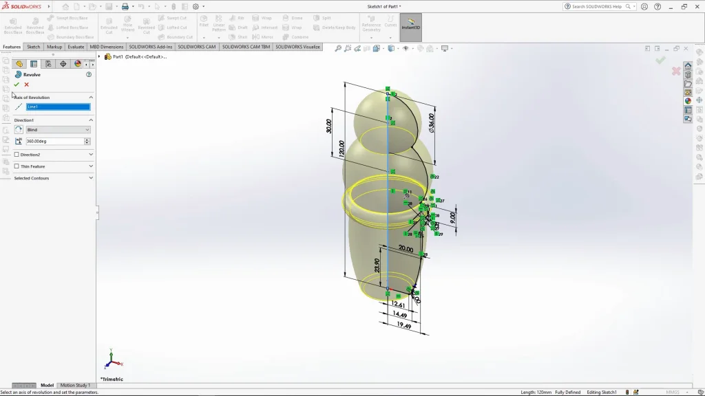 The revolve tool was one of the first tools that I experimented with when I started using SOLIDWORKS, its capabilities are endless, and you can be super creative with it. In this case it was used for both the skittle and the ball. When defining the revolve sketch, I took advantage of the fully define sketch tool, which quickly calculates, adds dimensions and defines your sketch, this can be useful if you’re unsure of how to define a sketch entity, but also if you want to do it quickly.