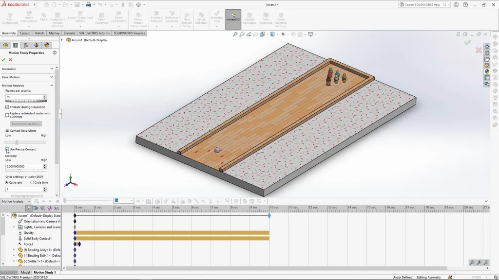 Only one skittle was created, decals were edited for each ice cream skittle colors, and save as was used to save 6 different skittle parts. Finally once all the parts were created, the bowling alley is brought into an assembly. As mentioned in the tutorial you need to ensure that the floor of the motion analysis is fixed. Otherwise the floor will just fall when gravity is added to the analysis. The motion analysis is really simple, but the results are quite fun, especially when you’re aiming for a strike! The skittles are mated to the alley floor coincident but this mate is suppressed for the motion analysis, otherwise the skittles would stay upright and just slide as the ball hits them. Gravity and contacts were added to the analysis, along with a force on the ball in the direction of the alley. Before the analysis is run, ensure that you tick the use precise contacts box, without this, the skittles fall before the ball even touches them.