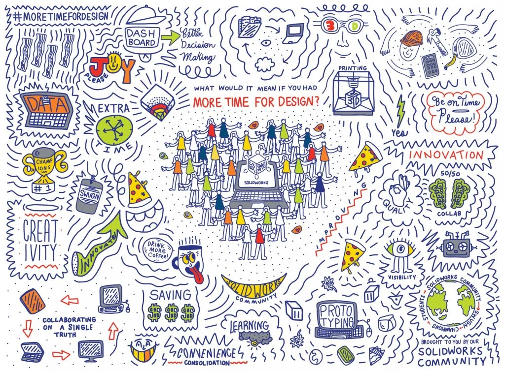 We partnered with Pretty Done, a Las Vegas-based freestyle pop artist to create a 10-foot banner that we are bringing to 3DEXPERIENCE World 2023 in Nashville that visually represents your feedback about what it would mean to have more time for design. Hint – the #MoreTimeforDesign banner, which will be in the “Old Hive” space, is very Instagramable!