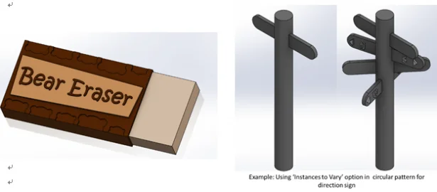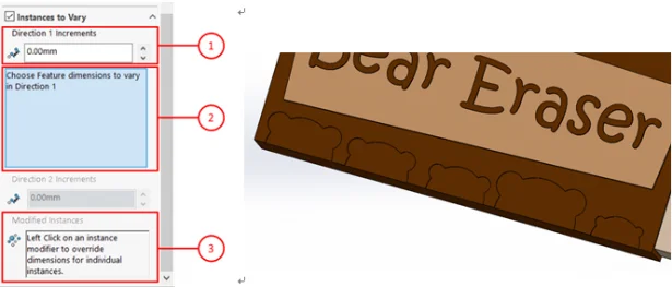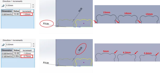 This part controls dimensions of instances. It can increase and decrease dimensions of instances cumulatively. First, you need to select the smart dimensions which was added in sketch of bear before. Then, you can input increment value (e.g. -1mm, -0.7mm). The radius of bear face and ear will decrease cumulatively (e.g. 14, 13mm… and 4.3, 3.6mm…)