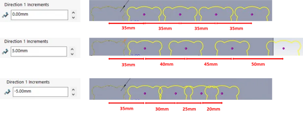 If the value is 0, the pattern will keep in equal spacing (35mm of Direction 1).