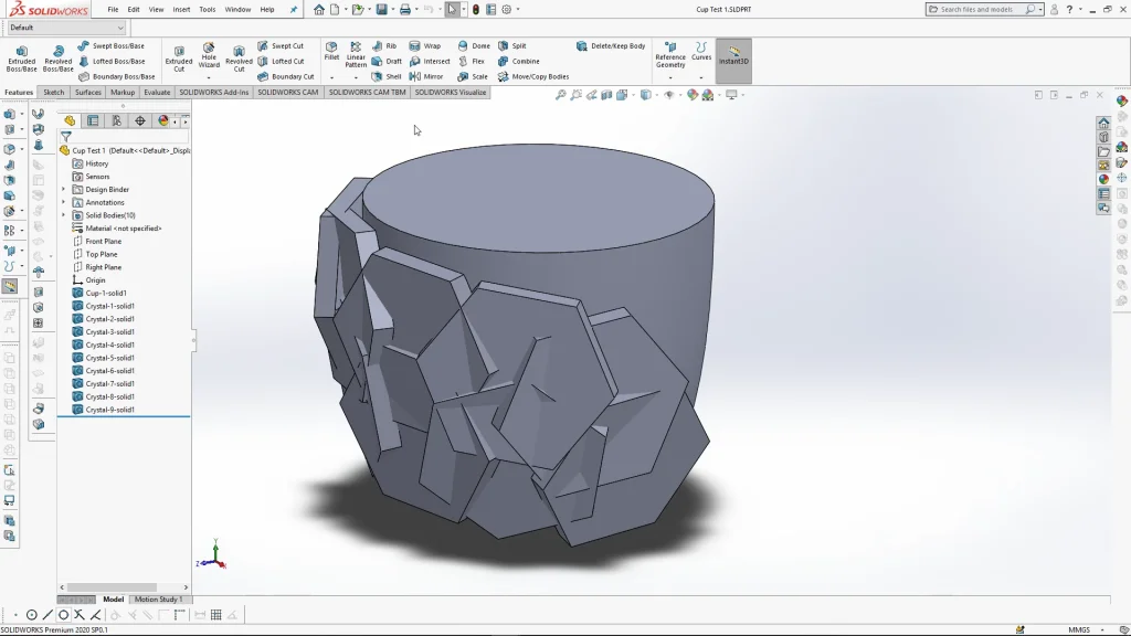 This SOLIDWORKS Tutorial for a Insulated ceramic coffee cup focuses on the use combine tool, during the tutorial you will follow and create a cup template and a crystal part to use within an assembly. Using an assembly multiples of the crystal part are pushed into the cup in a pattern, the assembly is then saved as a part. Opening the part up, the combine tool is used to cut away the crystal bodies to reveal a pattern that is both part of the visual design, but also how the cup is held.