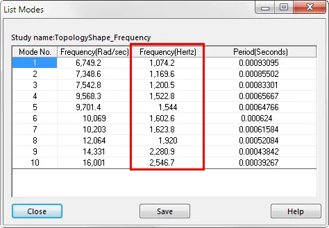 A frequency analysis is the first step towards addressing vibration issues. The results of a frequency analysis (shown below) report the natural frequencies of a design and its subsequent mode shapes.These are also referred to as resonant frequencies. So if an external load on the system is also a vibration source, and if that vibration coincides with one or more of the resonant frequencies of the design, load amplification is likely and so it’s worth investigating how the design responds to such a physical phenomenon.