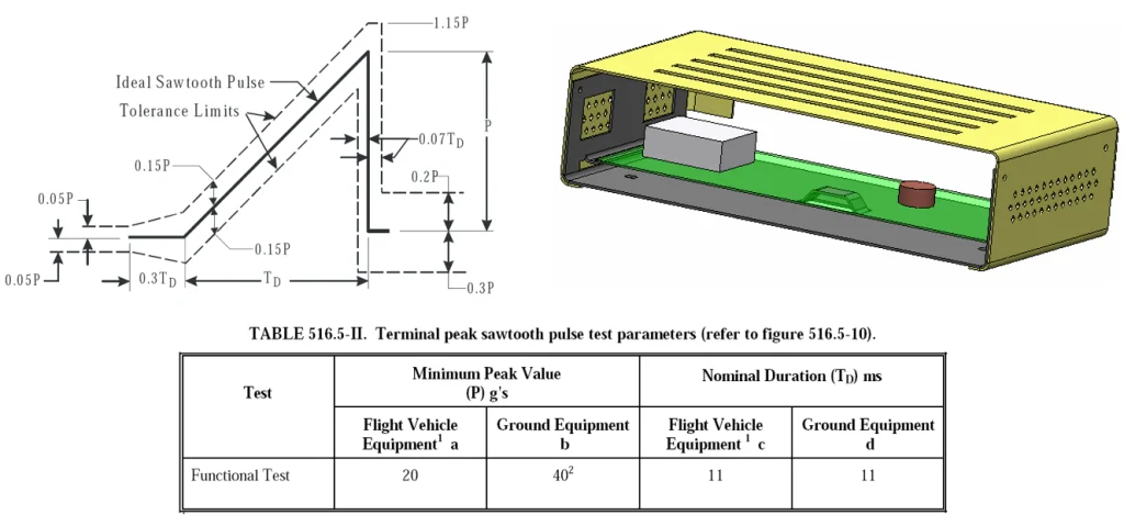 A sample shock test qualification for aircraft electronics enclosure testing would look something like the image below. We won’t go into specifics as it’s beyond the scope of this blog.