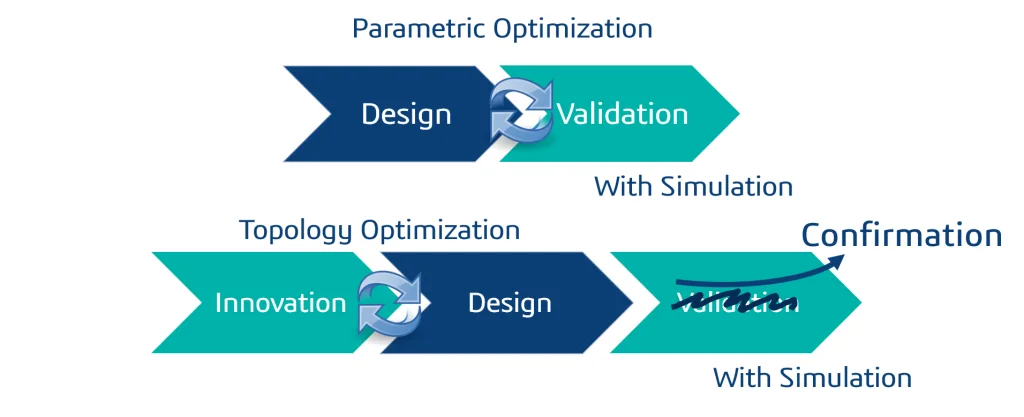 Parametric Optimization tools automate the design iterations when a set performance goal(s) is used to find the most optimal candidate design. Topology optimization adds one additional layer of sophistication. It helps guide the design process from the very beginning. And simulation becomes a final step in this workflow for a Confirmation on product performance.