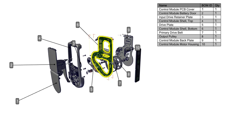 I selected the battery pack from this assembly and create another view (the links to connect the views will be added in the second step so you don’t have to worry about that right now). Using the transform tools, it’s easy to create an exploded view. Often with more simplified sub-assemblies this will be enough to address finding the appropriate part, especially with an interactive Bill of Materials created. It’s a simple process so might as well attach one to each exploded view you create.