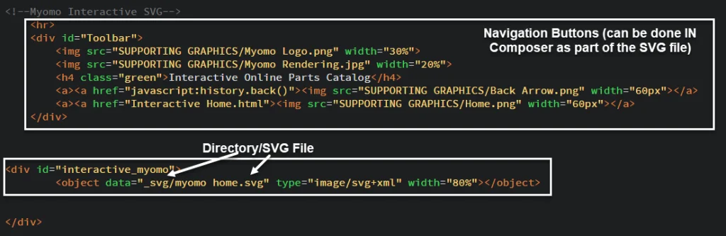 Next is step three, exporting the SVG files to a common directory. I use a ‘_svg’ subfolder in the same location that the HTML files are being saved. This makes it easy to reference the ‘main menu’ SVG file that will then reference all the subsequent svg files. When you are saving these images out, Composer will also create a series of sub folders in that same location to save out any supporting images (like the navigation icons I mentioned above). Keep these files in this directory as well. Each supporting 2D image get a new name and are referenced in the SVG file. You COULD create a single image instance if an image is used more than one, but would have to find and rename in the SVG and really isn’t worth the extra time to save a few kilobytes of space.