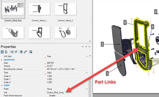 This gets us to the second step, creating the links. Links can be created FROM just about anything TO just about anything. For this type of content, a link from our defined hotspots for assemblies and parts for exploded views to the appropriate view is all we need. So essentially, drilling down from the top level, to sub assemblies, to exploded views to finally the final part.