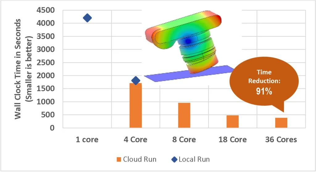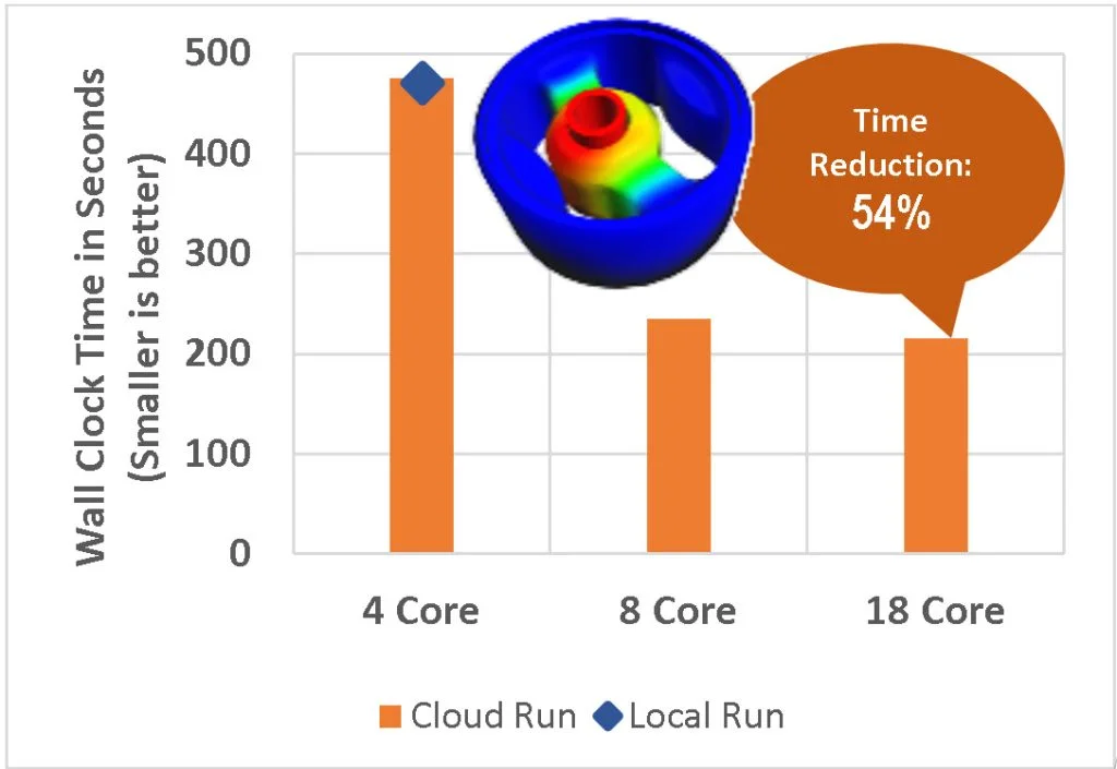 Below are three examples: a rubber bushing stiffness test, a camera drop test, and the bolting of a cylinder head onto an engine block test. These examples illustrate the time saved when running a structural simulation on the cloud versus locally. You will notice the scalability of the computation time when leveraging more CPU cores. As a user, you will see two benefits in one: reduced computation time and time saved by running the simulation remotely since your local computer system will be available for other work.