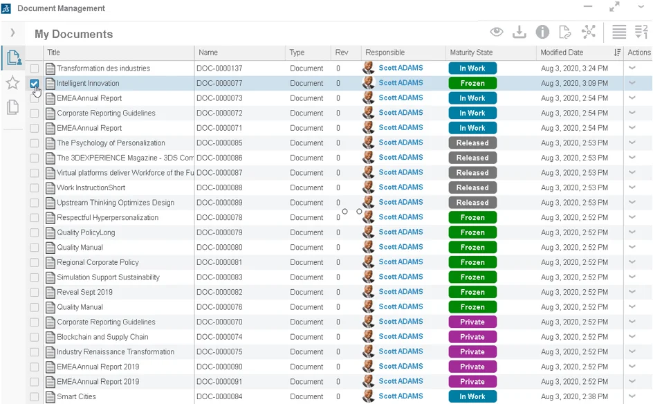 A new Document Management app, now available on the 3DEXPERIENCE platform, manages a variety of content such as PDF, Word documents, PowerPoint decks, images, videos, and much more. And the app is intuitive, easy to learn and use and automatically pulls in all the documents for your 3DEXPERIENCE Platform without the need to manually search for documents in different locations.