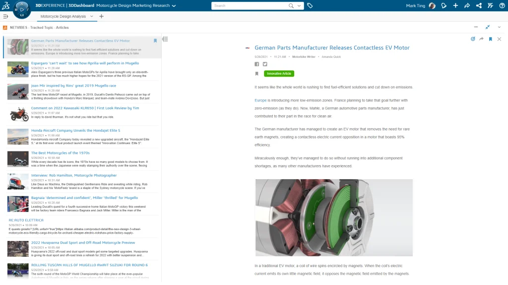 Consume, view, and drill down into the content inside a dashboard created by Social Business Analyst. You can leverage unstructured web and social data to get a real-time understanding of market trends and opportunities so you can identify how and when to develop the most promising products. You can learn customer likes and dislikes to make data-inspired product development choices that help beat the competition. When your dashboard is ready for analysis you can share it with Social Business Explorer users who can drill down into the charts, add commentary, and much more. Stay on top of industry-specific trends and news about your clients, suppliers, partners, and competitors. With the Social Business Explorer, you can drill down, review, and consolidate data shared with key decision-makers in secure 3DEXPERIENCE communities.