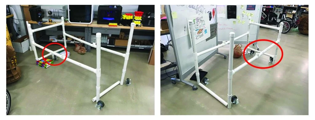 Originally, the PVC chassis was going to be on three wheels, for better maneuverability when Jonah goes over rough terrain (for example, if Jonah was trick or treating and his costume went on an uneven lawn). This approach proved to be unviable, however, as the team worried about the stability of Jonah’s wheelchair versus the stability of the costume chassis. The decision was made to move forward with a four-wheel PVC chassis, which opened up more stabilizing opportunities. With the chassis design decided on, the truck wheels could start to take precedence.