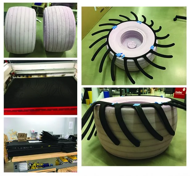 The wheels of the mini-Max-D are eight layers of foam, designed to have a matching inside diameter. There was no point in matching up the outside, since those sides would be sanded down. A finished wheel is about 17” wide and 28” in diameter—because we like doing things to scale at SOLIDWORKS. Now that they’ve been machined, the transformation into treaded, realistic monster truck wheels has begun. After the wheels are glued and screwed together, they are sanded and primed. Black rubber has been laser cut to resemble treads, and the wheel flowers are blooming into incredible costume pieces!