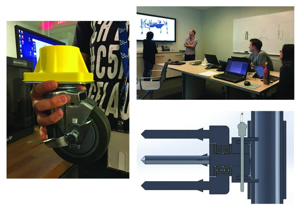 To lighten the weight of the costume (and keep down costs down—the SOLIDWORKS Magic Wheelchair Project is funded entirely by the SOLIDWORKS Education Department), the team is trying to 3D print as many components as possible. So far there are 3D printed holders for the casters and the PVC pipes that make up the chassis. They are also discussing 3D printing the majority of the mechanism that will hold the wheels to chassis.