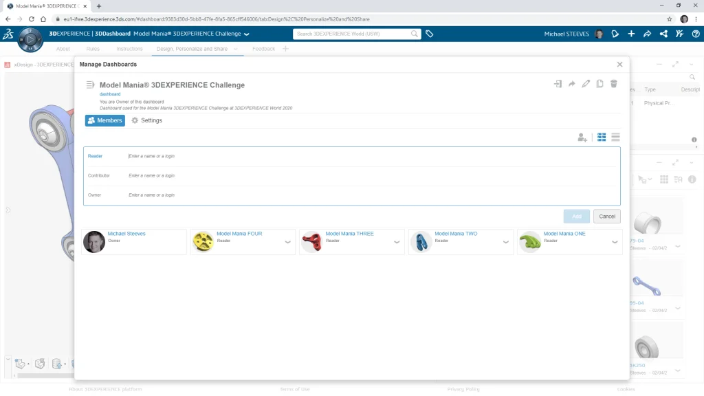 At the Model Mania booth in the 3DEXPERIENCE Playground, we had four computers set up for the challenge. Each computer used a unique account to the platform. When you have a dashboard that has value for multiple users, you may share that dashboard. This meant that as the administrator, I had no software to install or additional user configuration. I just had to open the web browser and log in as each user. That’s it.
