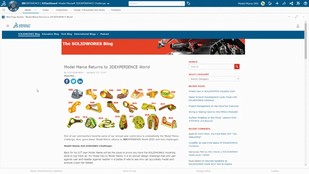 In the launch of the new Model Mania 3DEXPERIENCE Challenge, we used many tools that the platform has to offer, including dashboards to organize information and tools, collaborative spaces to store and share data, communities for social engagement and the search and filtering tools to reveal the winners.