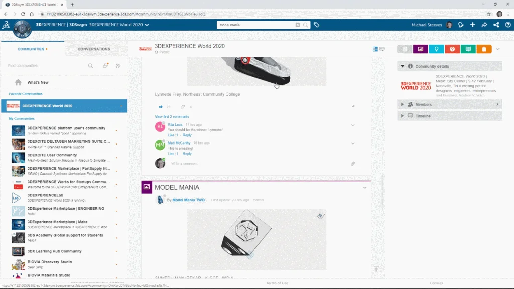 When a participant was ready to share the result of their cloud CAD modeling skills, they used the dashboard to publish an image of their model to the 3DEXPERIENCE World 2020 Community. This is where the community would decide the winners.