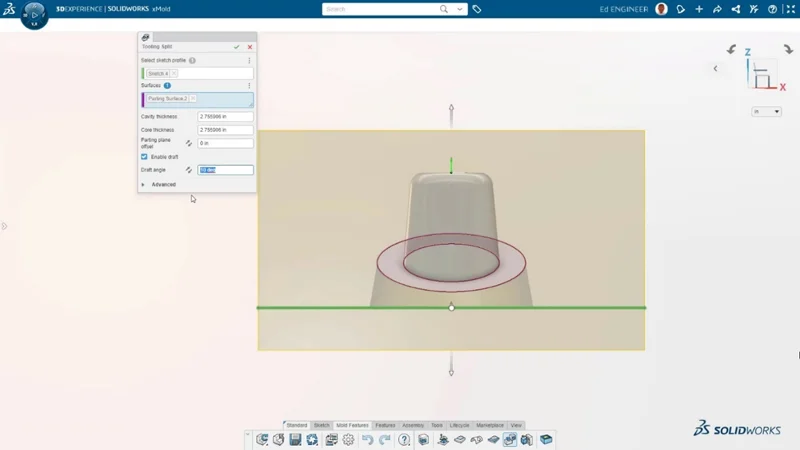 This feature is perfect for creating a draft from a parting line that is created by splitting faces on a part for the purpose of creating two or more molded parts.