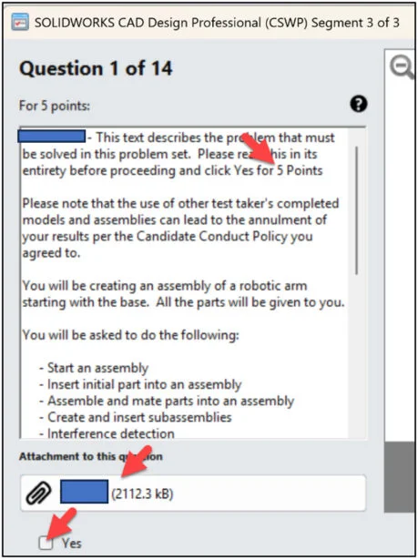 The first question is an instructional page. Read the instructions. Agree to the Candidate Conduct Policy. Click Yes. It’s a free 5 points. Click the link to download the components and sub-assemblies. Save the downloaded files to a working folder, (Extract All).