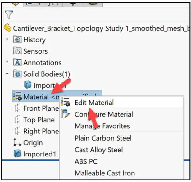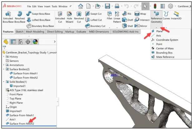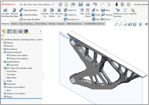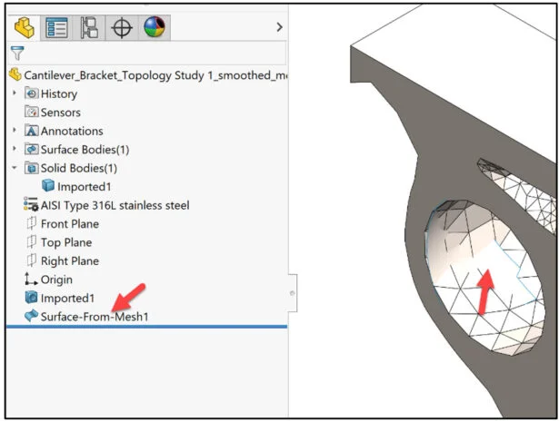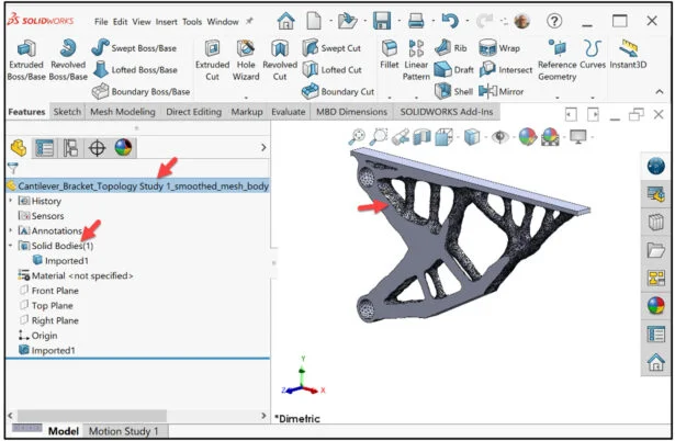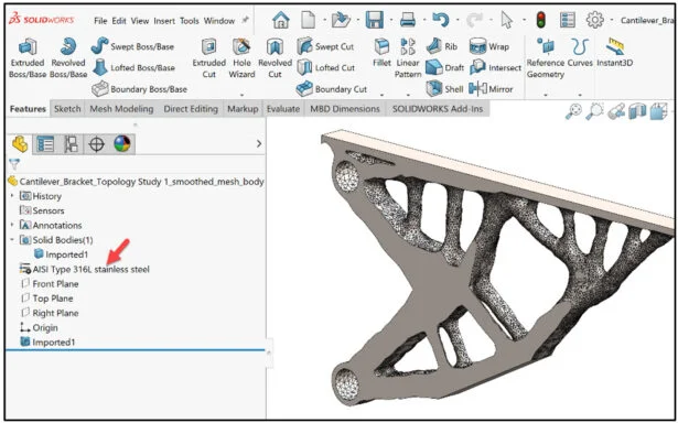 Open the SOLIDWORKS Cantilever_Bracket_Topology Study 1_smoothed_mesh_body part your created in Lesson 3..