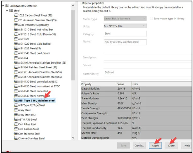 In this example, we selected 316L stainless steel. Click Apply. Click Close from the Material dialog box.