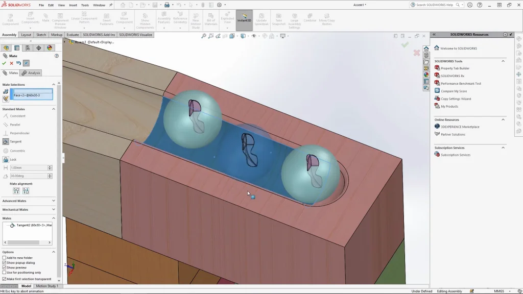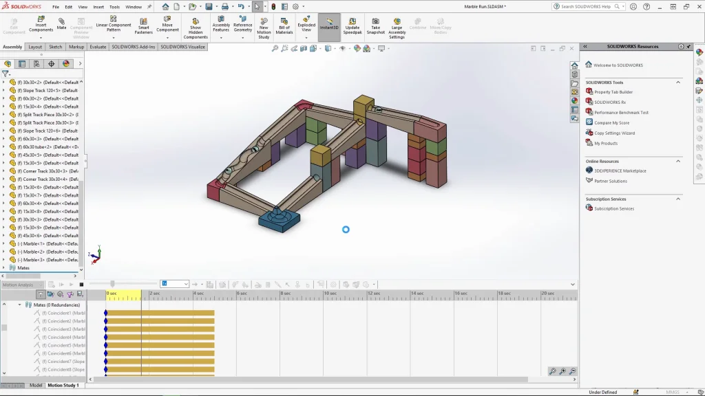 Once all 10 track pieces are done, I added stained wooden appearances to each before re-saving the parts and closing them ready for the assembly. When creating the assembly, it’s always easier to start with the end track and work up, I added components in stages to overwhelm myself with parts to mate. Ensure that all the parts are fully mated in place, so they don’t move as you’re adding more parts too. With the marble run fully assembled I fix all the track parts ready for the motion study. If you don’t fix these parts, they may just fall through the floor of the assembly, doing this also ensures that they don’t interfere with the analysis. The marbles are dropped into the assembly at the top of the starting track block and are mated with a tangent mate, but only temporarily for placement.