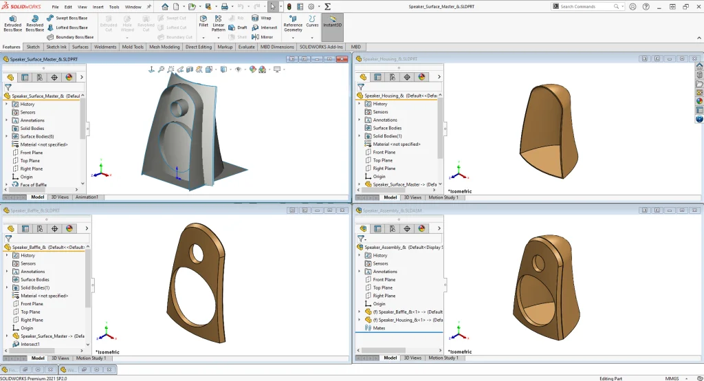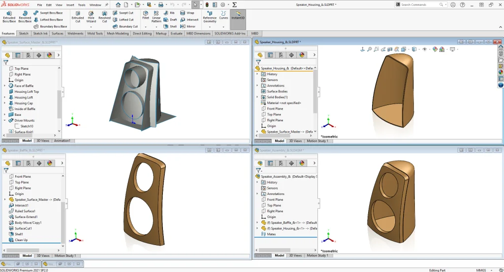 The master modeling technique is nothing new. In fact it’s been a common practice in 3D CAD since before SOLIDWORKS even came on the scene in 1995. If you aren’t familiar with it, the basic idea is that your end product, let’s say some industrial designed enclosure, is one continuous shape, but it’s actually manufactured as many different bodies, sometimes made of different materials that are then assembled together. Rather than making a bunch of individual parts, you create one “Master Model” that represents the overall shape and that drives the shapes of all the downstream components that contain all of the little details, like lips and grooves, fastening features, or cut outs and vents. Now when a change is made to the overall shape, it can be made in one place and all of the downstream components update. You may have come across an example if you’ve ever taken the SOLIDWORKS Advanced Surface Modeling training course where a master model for a computer speaker is created by using the “Insert Part” feature into the beginning of each of the components feature trees.