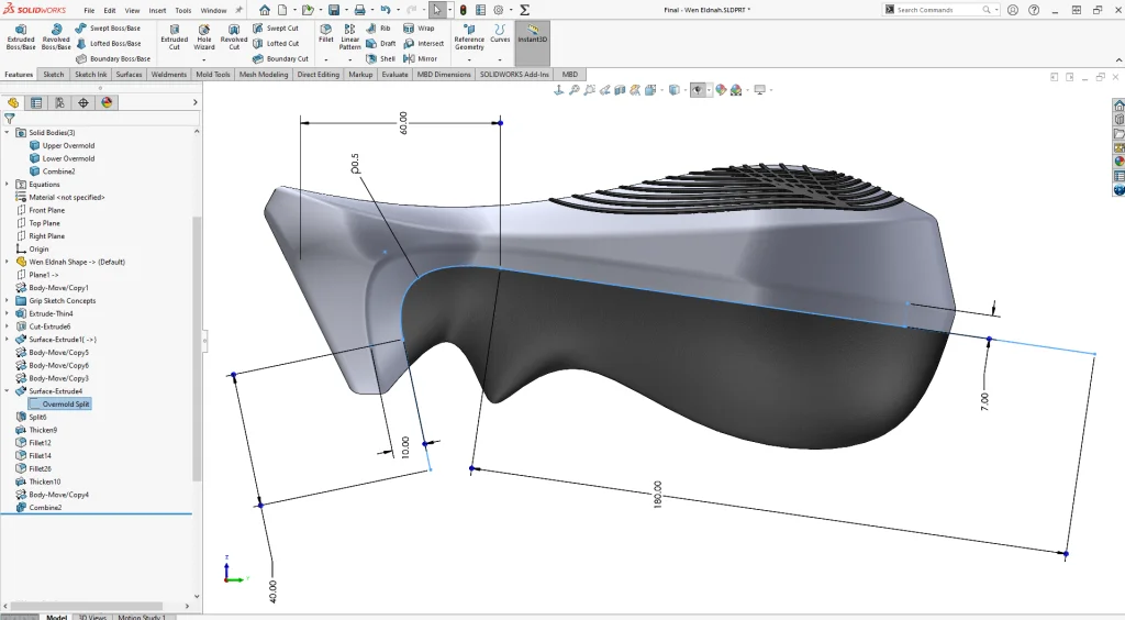 Next I’ll add some fillet blends and an overmold created from a sketch that is directly related to vertices on the master model (some of you are probably wondering if they will update okay…)