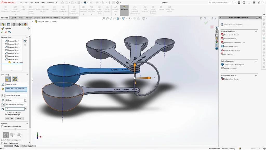When the parts are all complete, the spoons are mated onto the ring concentric in an assembly ready to create an exploded view. In the exploded view, the temporary axis of the spoons handle holes and metal ring were used to define the axis of rotation for the spoons, to ensure that they rotated on the ring and not from there own centre axis. The exploded view could then be brought into a motion study, using animation and the exploded view I edited the keys of the exploded view to speed up the movements of the spoons and then exported the motion study to SOLIDWORKS Visualize.