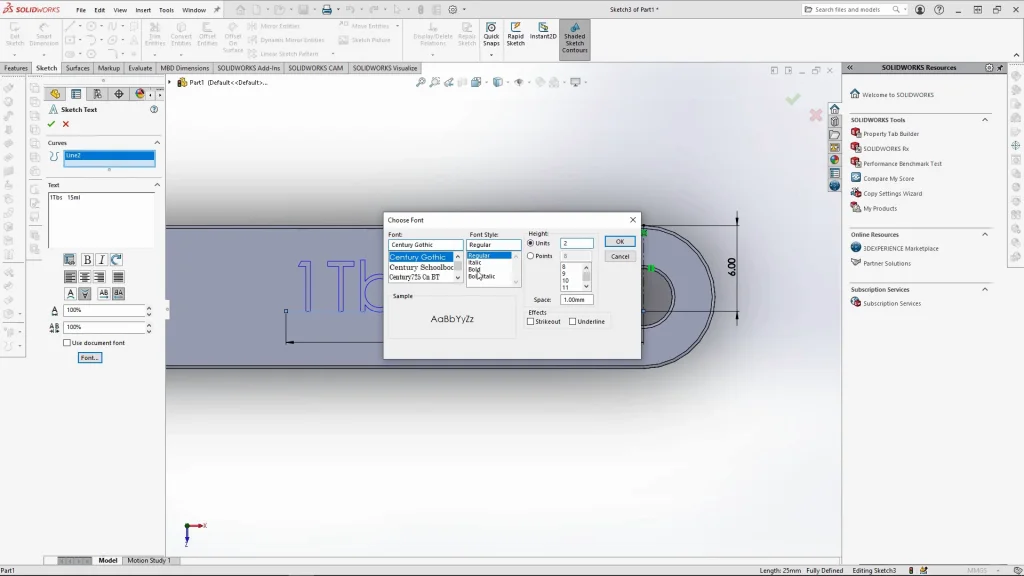 Another feature of the tutorial is the use of the text tool to apply the measurements of each spoon. Guide sketches were created before the sketch was added so that it could be applied to an exact spot on the handle, the font could then be edited by font type, font style and the font size. Once the first spoon was finished, the part was saved but kept open. It was then used to create the other 4 spoons by rolling back features and editing the sketch of the spoons radius, then double checking the new volume. The handle length was increased so that each spoon sits into each other with the ring hole lined up. And finally, the text was edited to represent the spoon size. Each spoon was then saved with a new name, this method can save you so much time when created similar shaped parts.