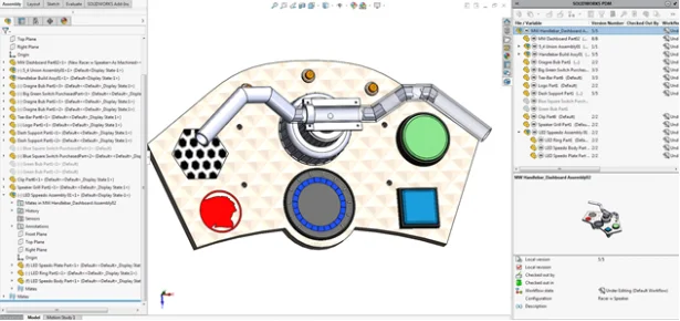 Stephen created the dashboard CAD in SOLIDWORKS, but the team went old school to determine the fit. They cut a piece of cardboard to size in the finished costume, then took the cardboard with them to a local store to purchase both necessary electronics and fun components for Ben to play with.