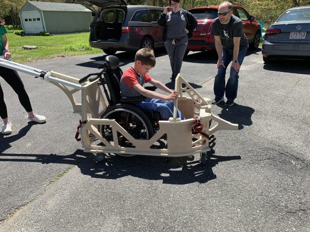 Three weeks ago, Chinloo and Sal Lama traveled to Ben’s hometown to test out the costume’s frame and dry fit it to his wheelchair. Ben’s caretaker, Amanda, pushed the wooden frame around her driveway and found it was relatively easy to push around, “Like pushing a grocery cart,” she said. She thinks she’ll have a relatively easy time maneuvering Ben in his costume, both for the reveal and for Halloween.
