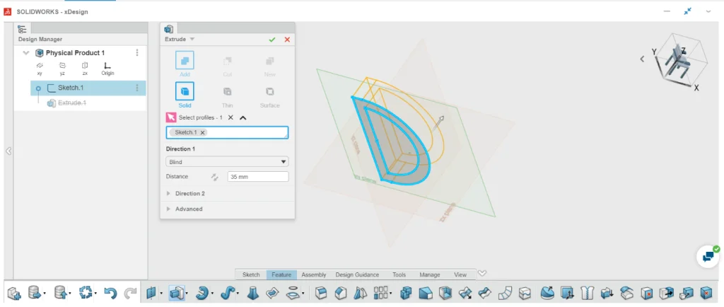 Like many other CAD tools, creations start out with a sketch. After sketching your creation, you can then use the Extrusion Boss, one of the easiest features to use. SOLIDWORKS xDesign provides different tools/ ways you can use to achieve a desired geometry – by picking the distance, making it infinite, extruding until a surface, and so on, but the cool thing is that it is all with a visual response. The automatic preview helps you choose the exact way you want to approach building the geometry, and this forms the basis of Intent-based Parametric Modelling.