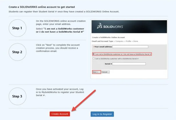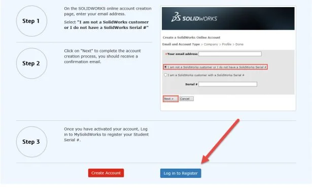 This will bring you to the SOLIDWORKS Customer Portal, which will pop up in a separate window. This is so that you will be able to see the instructions while creating your account. Once you have activated your account following the instructions within MySolidWorks, click on the blue “Log in to Register” button next to the red “Create Account” button you clicked earlier.