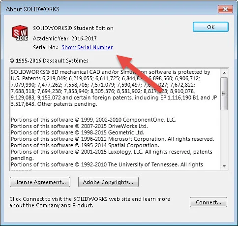 This will bring up a small window that displays all of the information about your specific version of SOLIDWORKS. Click on the blue hyperlink “Show Serial Number,” and your number will be displayed.