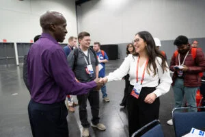 • Show up early and linger. People often arrive before sessions start — a great chance to strike up a conversation.
