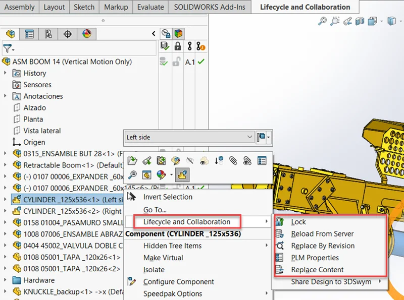 With Collaborative Designer for SOLIDWORKS you can totally take advantage of data management capabilities right from the Feature Manager Tree, including the ability to view and change the lifecycle status, replace files with revisions, and save data to the platform.