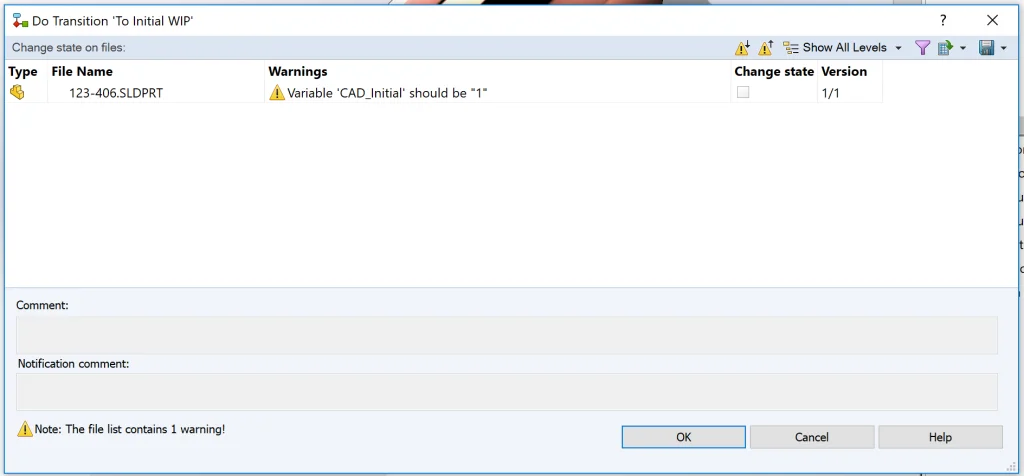 Once the file is saved, checked in, and attempting to change state to “Initial WIP,” the file will fail to transition.